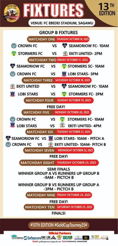 Ekiti United Football Club has been placed in Group B of the 13th Edition Gold Cup Preseason Tournament, facing strong rivals including Lobi Stars of Makurdi, Seamorriow FC, Stormers FC, and Crown FC.