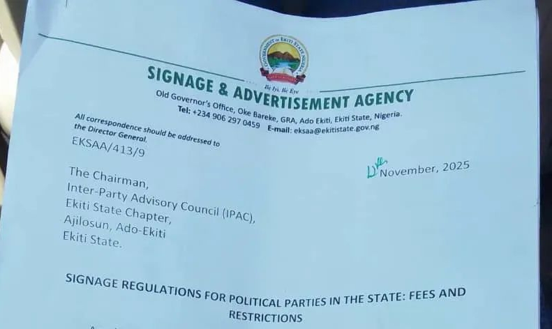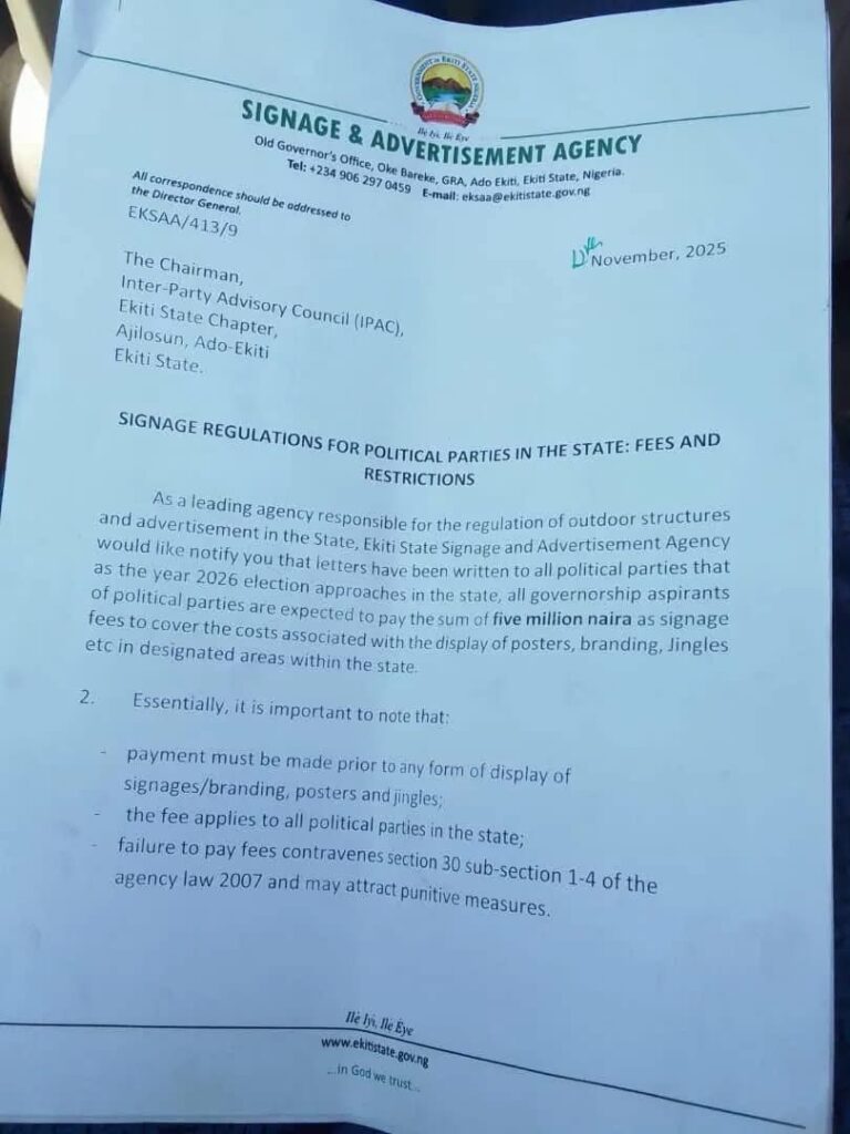 The Ekiti State Government has insisted that political parties must pay a ₦5 million fee before putting up campaign posters, billboards, branding, or jingles ahead of the 2026 governorship election.