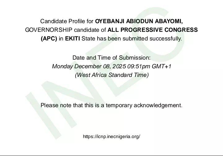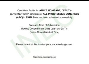 The All Progressives Congress (APC) has reportedly submitted the names of Governor Biodun Oyebanji and his deputy governorship candidate, Mrs. Monisade Afuye, to the Independent National Electoral Commission (INEC) portal as their candidate and running mate for the forthcoming election in Ekiti State on December 8, 2025.