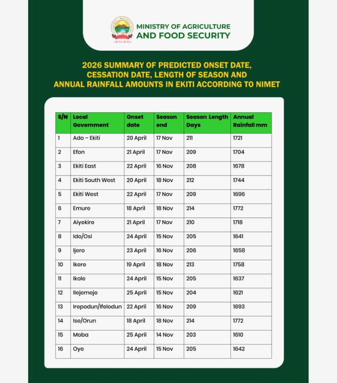 A statement from the Ekiti State Ministry of Agriculture and Food Security, made available to newsmen in Ado-Ekiti said the Nimet forecast outlines the expected onset and cessation dates of rainfall, as well as projected annual rainfall totals across the stateβs 16 local government areas.